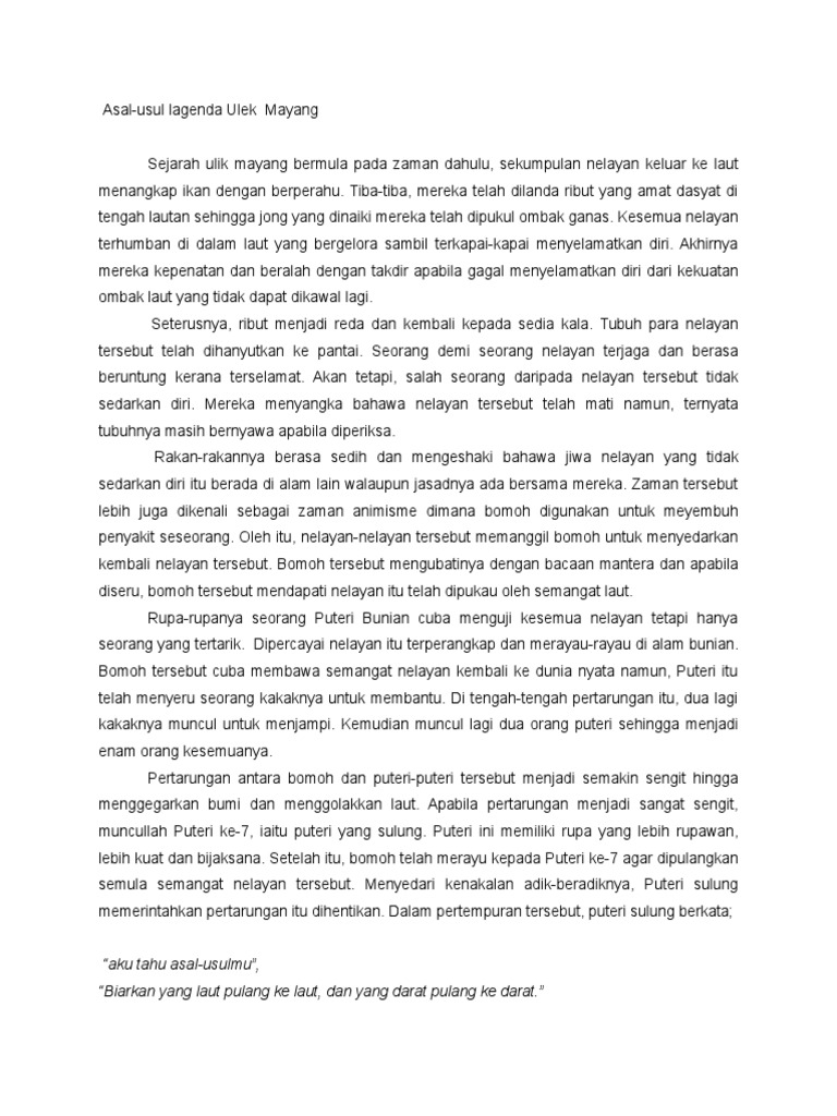 . Sedang mereka di tengah laut tiba-tiba ribut menghambat dari segenap arah membawa ombak yang memukul jong yang dinaiki. View ulek mayangpdf from RM 400 at Tun Abdul Razak University. Ulek Mayang berasal dari Terengganu dan merupakan sebuah lagu dan tarian masyarakat dahulu yang dipersembahkan sebagai upacara.